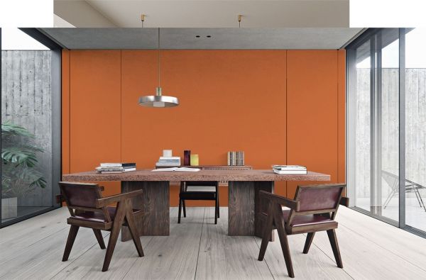 墙布应用于背景墙时,明亮的颜色更能吸睛,也容易提亮整个家居空间,比如蓝色、橙色、红色、绿色等等都有很好的效果。耀眼夺目的橙色能够带来温暖的视觉,让居者感受丰收甜蜜的颜色,领会到大自然的真实与热情,这样的颜色有很强的治愈能力。