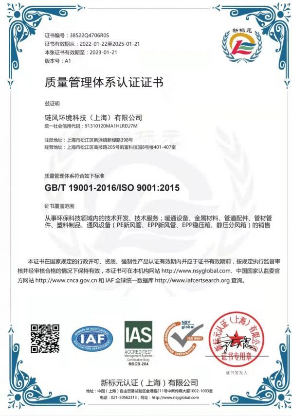 把新鲜空气输送到每一户家庭,每一个角度,是链风不变的企业愿景,而三大管理体系认证的通过则是链风迈向目标的新起点。