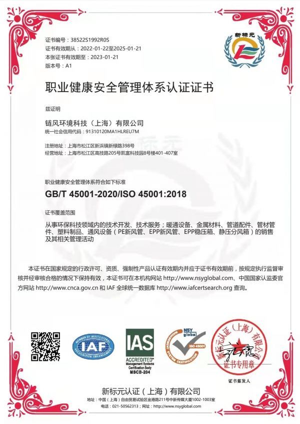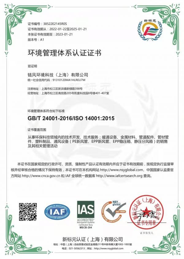 2022年1月22日,经过权威认证机构的多轮严格评估和审核,链风环境科技(上海)有限公司顺利通过ISO9001质量管理体系认证、ISO14001环境管理体系认证和ISO45001职业健康安全管理体系认证。