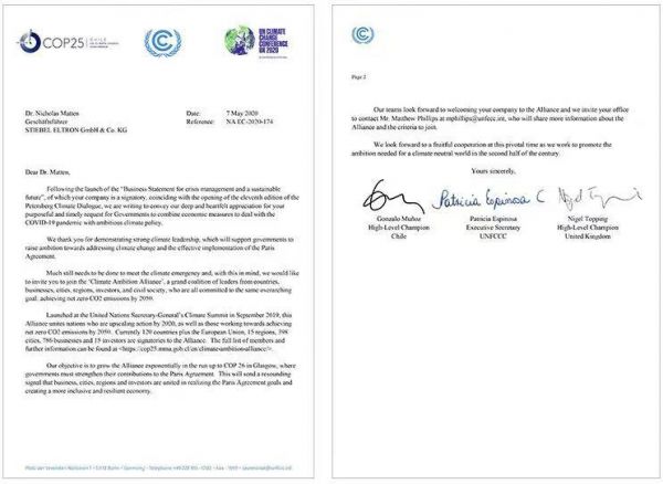 2020年5月12日,联合国致信斯宝亚创集团,感谢斯宝亚创对气候保护做出的承诺。