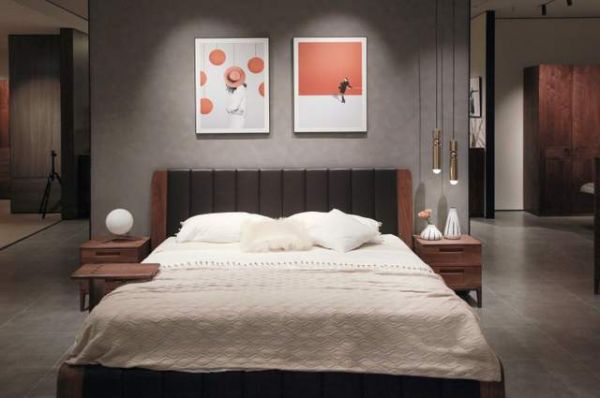 符合人体工学的宽幅靠背床头,每一次依靠都能给予满满的舒适和安全感,在睡前最大程度释放脊柱压力,缓解工作一天的疲劳。床体L型拐角一气呵成,靠背和床位采用牛皮包覆,手感细腻柔韧,减少了磕碰的风险,好似躺入一个柔软的怀抱。黑胡桃木经德式工艺多道工序的打磨展现出特有的细腻纹理,沉稳敦厚,无需过多色彩装饰,它自是一件艺术品,彰显着生活本质。