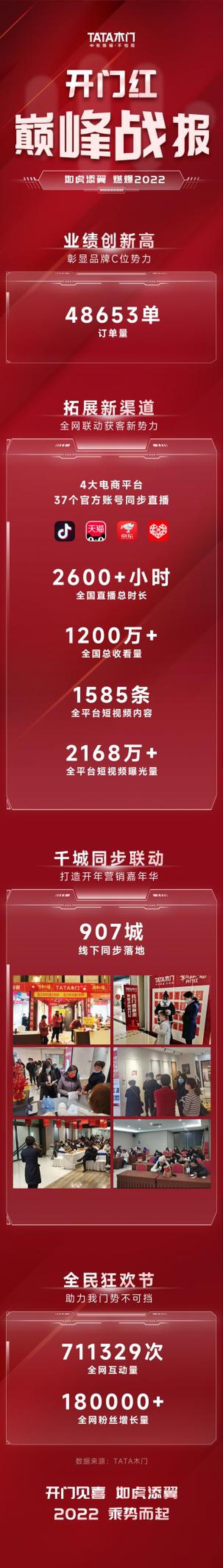 直播总时长超2600+小时、全平台视频内容1585条、其短视频曝光量突破2168万+,总收看量超1200万人,全网互动量711329次、全网粉丝量猛增18万+,并最终实现了48653单的成交转化......这一连串的数据就是TATA木门在春节期间启动的开门红营销的战报数据。全国范围内37个官方账号在抖音、天猫、京东和拼多多四大平台同步直播联动,TATA木门用一场直播再一次证明了品牌的高度与品牌号召力。