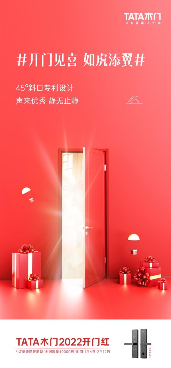 据了解,TATA木门今年的开门红自1月4日便在线下率先启动,并于1月24日,线上营销跟进,最终在2月12日集中引爆。配合本次开门红活动TATA木门拿出了多款“放价”产品,并投入千万补贴,从花色到材质,从款式到设计,对消费需求一网打尽,不仅有镇店爆款5折起、新品尝鲜一口价,更有旗下产品入户门、静音窗等配套降噪静音产品。而“开门大促,只补这一把”,更是祭出了4万把智能门锁的补贴,市场价1599元/把的智能锁,活动期间仅需9.9元,仅这一下就将补贴做到了4500万。