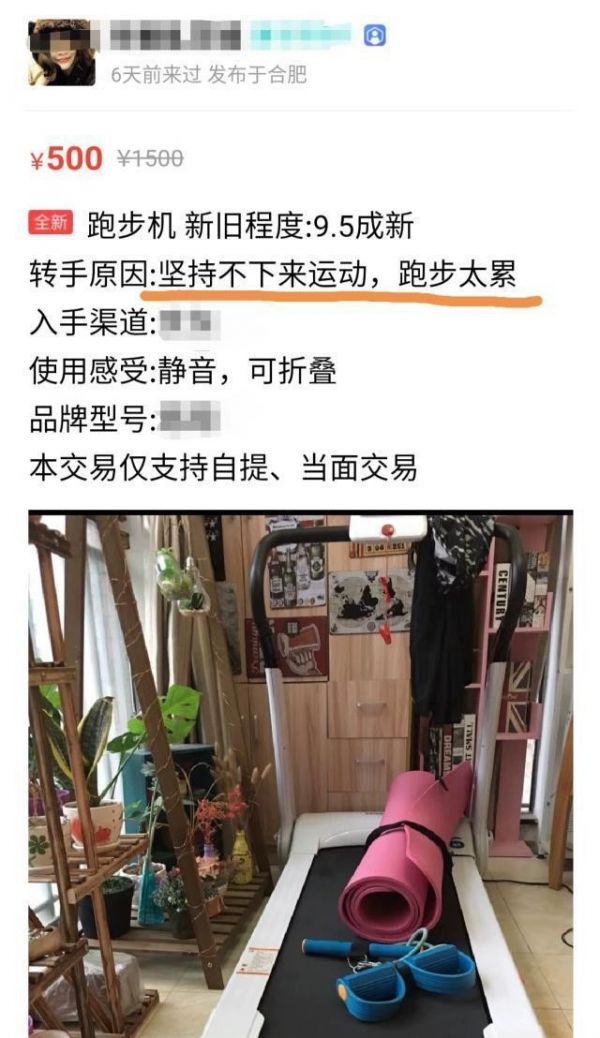 这不,又有人将自己购买的跑步机挂在了某二手平台,转手原因:坚持不下来运动,跑步太累!还特别说明新旧程度95成新,而小编觉得一定比95成还要新,因为大部分的人在使用两周至一个月左右的时候,就知道能否将跑步坚持下来。
