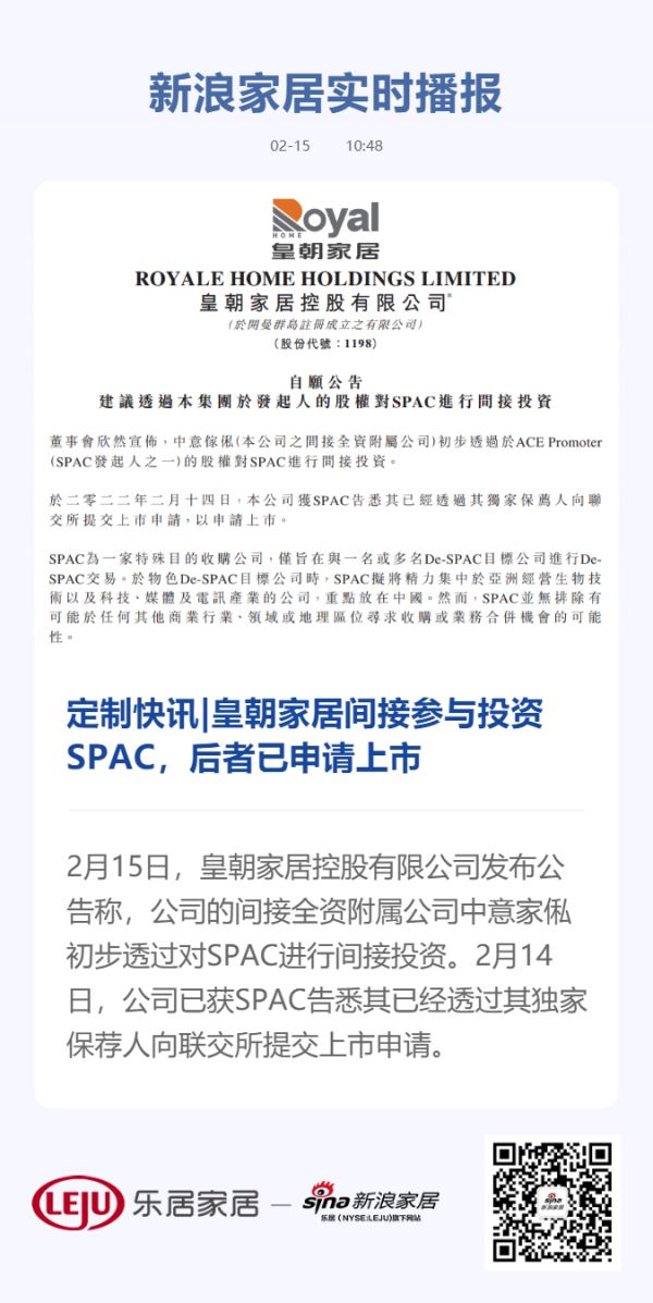定制快讯|皇朝家居间接参与投资SPAC,后者已申请上市