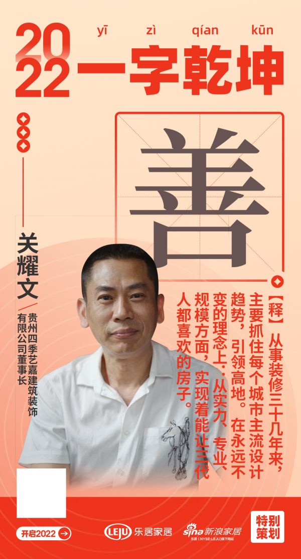 在“2022一字乾坤”活动中, 贵州四季艺嘉建筑装饰有限公司总经理关耀文用「善」表达了2022年的规划和目标: