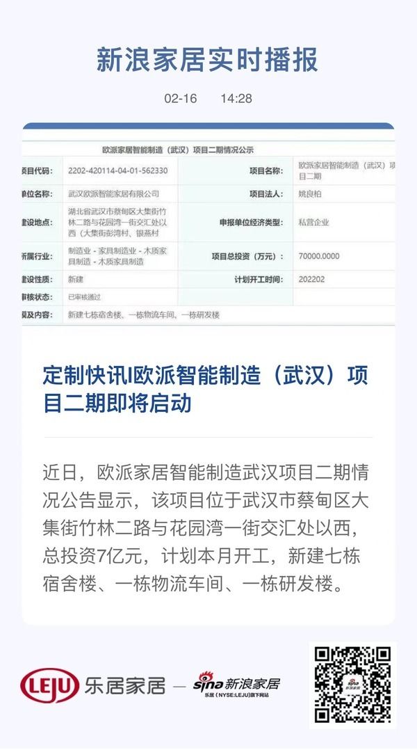 新浪定制频道讯 近日,欧派家居智能制造武汉项目二期情况公告显示,该项目位于武汉市蔡甸区大集街竹林二路与花园湾一街交汇处以西,总投资7亿元,计划本月开工,新建七栋宿舍楼、一栋物流车间、一栋研发楼。