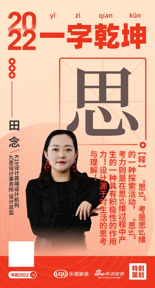 在“2022一字乾坤”活动中, K19设计高端设计机构 九思设计事务所 设计总监田念用「思」表达了2022年的规划和目标: