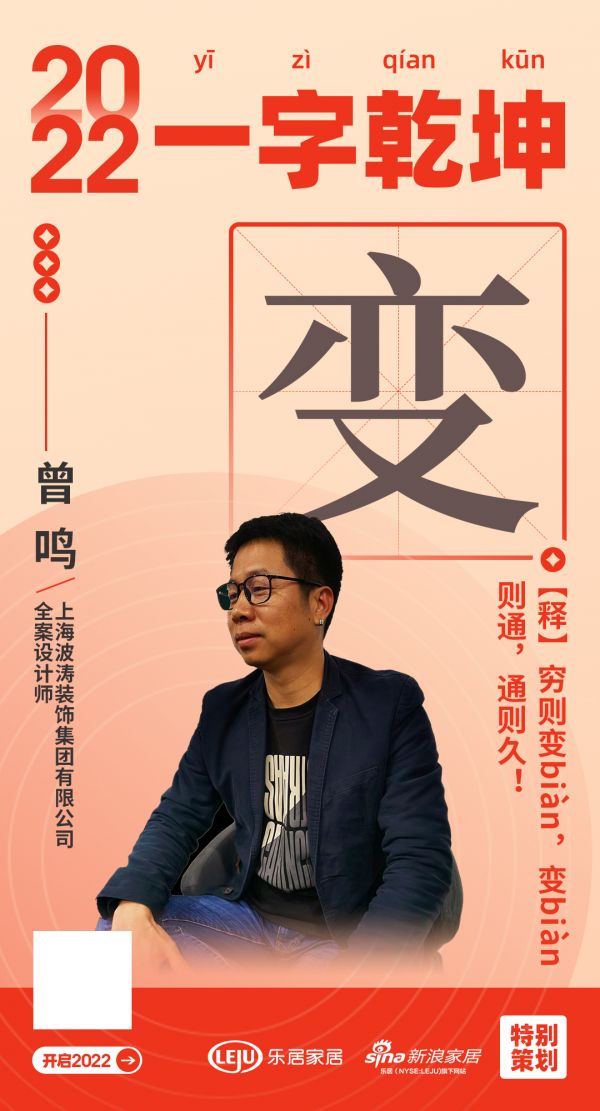 在“2022一字乾坤”活动中,上海波涛装饰集团有限公司全案设计师曾鸣用「变」表达了2022年的规划和目标:
