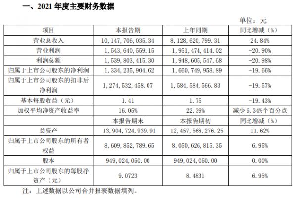 老板电器:2021年度公司实现营业收入10,147,706,035.34 元,同比增长 24.84%;实现归属于上市公司股东的净利润 1,334,235,904.62 元,同比下降 19.66%。