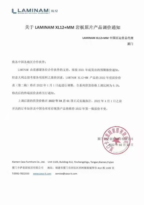 近日,LAMINAM发布调价通知,经意大利总部考量各项原料涨价因素,LAMINAM XL12+MM岩板全系列产品价格上调9.5%,新价格表将于4月1日正式执行。佛山知名岩板营销平台发出通知,3月10日起用新单价表,各类产品均涨价5元/㎡左右。另一佛山知名陶企也发出大规格岩板涨价通知,也是3月10日起涨价5元/㎡左右。但其涨价对象写明是OEM客户。