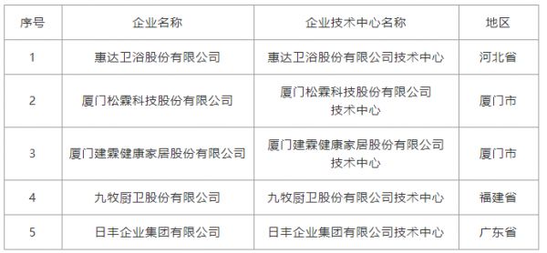 2月23日,国家发展改革委等部门印发2021年(第28批)新认定及全部国家企业技术中心名单。截至目前,国家企业技术中心共1601家,分中心共105家。其中,惠达卫浴股份有限公司、九牧厨卫股份有限公司、厦门松霖科技股份有限公司、厦门建霖健康家居股份有限公司等卫浴相关企业被列为国家企业技术中心。