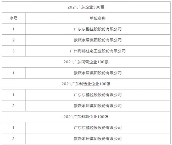 近日,广东省企业联合会、广东省企业家协会联合发布2021广东企业500强系列榜单。其中,欧派家居集团股份有限公司入选广东民营企业100强,东鹏、欧派等企业入选广东制造业企业100强,东鹏、欧派等企业入选2021广东创新企业100强。