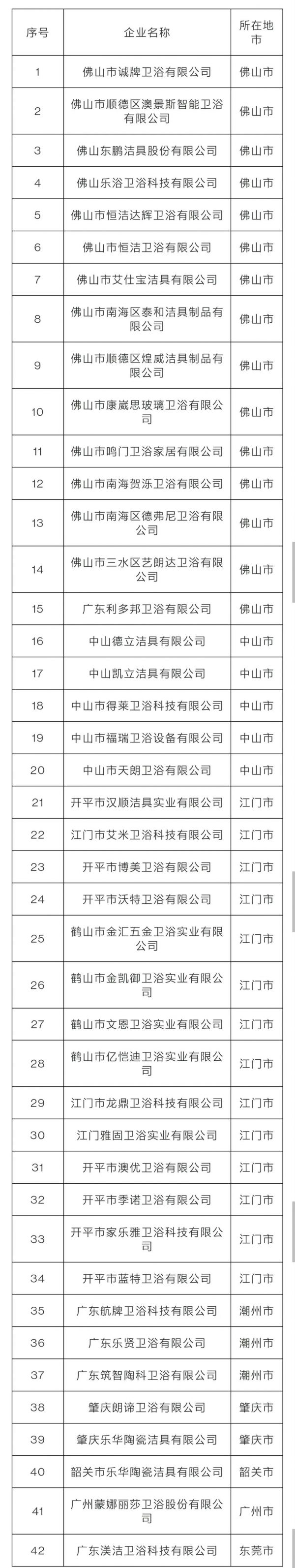 2月17日,广东省科学技术厅等公布了广东省2021年第一批、第二批高新技术企业名单,共有8800家广东企业入选。其中,与卫浴相关的企业达42家,分布在佛山、江门、中山、潮州等地,包括佛山东鹏洁具股份有限公司、佛山市恒洁卫浴有限公司、肇庆乐华陶瓷洁具有限公司、中山德立洁具有限公司、中山市福瑞卫浴设备有限公司等知名企业。