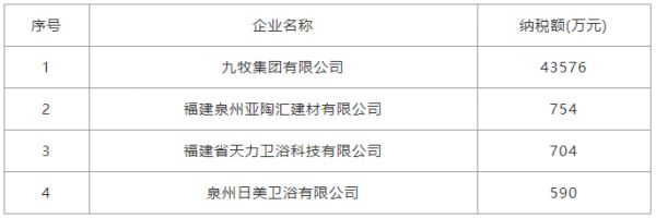 2月11日,南安召开城市与产业发展大会暨招商大会,公布了2021年度全市纳税大户名单,共有218家企业入选南安市2021年度纳税大户,包括九牧集团有限公司、福建泉州亚陶汇建材有限公司、泉州日美卫浴有限公司等卫浴企业。其中,九牧集团有限公司以43576万元的纳税额成为南安市2021年度纳税额排名第二的企业。