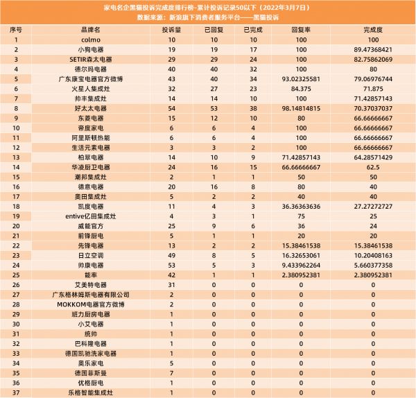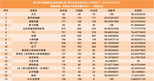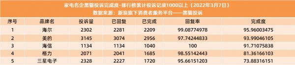 家电名企黑猫投诉完成度排行榜 6家企业实现完成度90%以上(2022年3月7日数据)