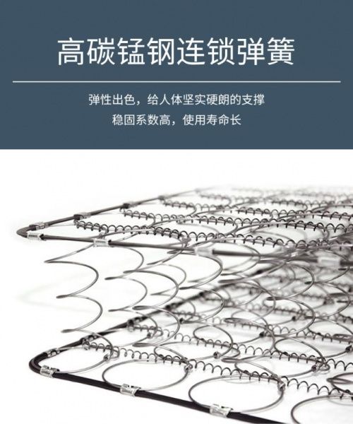 床垫内部采用2.3线径的高碳锰钢连锁弹簧组网成床,具有出色的支撑力和强大的韧性,为人体提供坚实有力的支撑。东宝床垫的弹簧经过8万次耐久性测试、2次高温热处理和防锈处理,经久耐用,床网质保十二年。