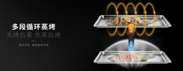蒸烤功能实现了多段循环,自由烹饪,激发美食灵感。150℃高温蒸,高效脱脂减盐迅速锁鲜;创新应用双蒸汽发生器,双直喷大蒸汽,轻松穿透食物,锁住食材鲜美。在烤功能上,创新研发双NTC探头,上下独立控温,配合3重隔热门技术,牢牢锁住热量,230℃高温热场烤,加热上色更均匀!