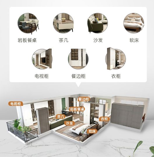而从舒适性来看,除了定制能根据家庭不同情况及使用需求进行科学设计与规划,让生活更方便快捷外,套餐内所含的成品家具种类丰富,从科技布沙发、软包床、到岩板茶几、岩板餐桌椅、乳胶床垫、乳胶枕............多样家居的选择,全方位地满足了不同家庭对舒适生活的需求。