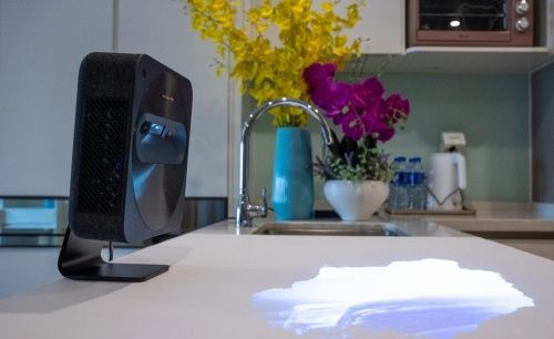 除了在抗光屏上投影,这款峰米R1 Nano竟然还可以在桌面上投影仪,只要搭配上专用的支架,桌面、地面、厨房的操作台,都能成为投影的屏幕,一边学做菜一边直接操作,这种用法也是蛮新奇好用的。