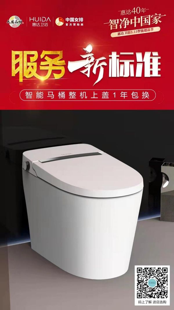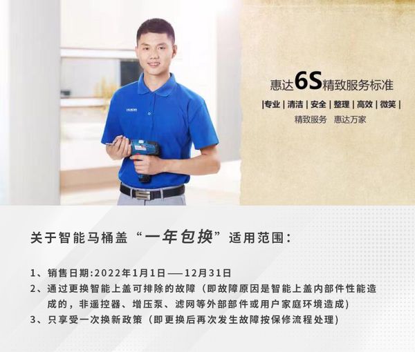 为满足消费者高品质的美好卫浴生活需求,免除智能马桶售后服务担忧,惠达卫浴推出售后服务新标准“智能马桶整机上盖1年包换”!