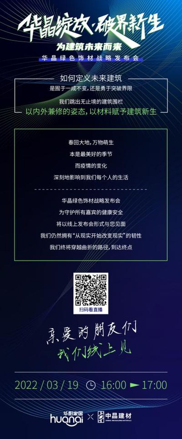 2022年,国内领先的家居服务商华耐家居与中晶建材达成战略合作,成立华晶绿色饰材有限公司。华耐家居作为家居服务企业,始终将成就中国人的美好家居生活作为目标使命;中晶建材作为绿色环保高科技创新型企业 ,深耕建材研发领域,研发出满足多种空间的高品质绿色科技建材产品,两个企业强强联手,优势互补,从产品研发、生产制造、渠道开拓、营销服务等领域深入钻研合作。2022年3月19日,华耐家居X中晶建材,华晶绿色饰材战略发布会将以线上直播形式与大家见面,中晶晶板和华耐晶华板六大系列将璀璨亮相,企业领导、研发专家、行业协会领导、建筑师、以及行业媒体将共同见证这一颠覆时刻,这样的战略合作是行业内合作的新标杆,同时将赋能产业,打造行业高质量发展的创新典范,为产业发展注入新动能。