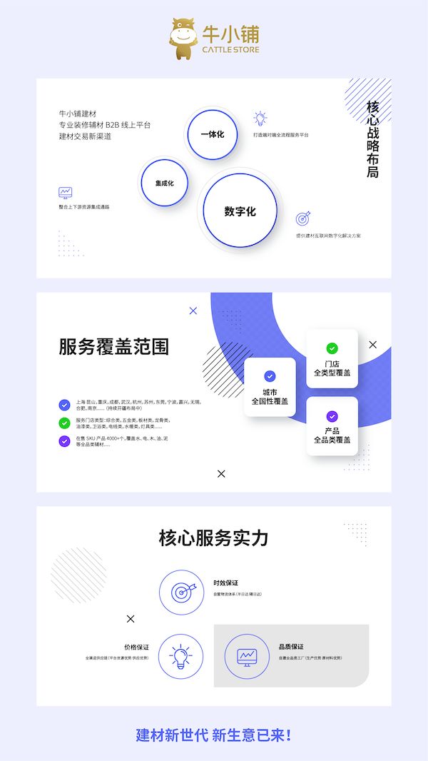 牛小铺作为专业装修辅材B2B线上平台,致力成为建材交易新渠道,践行行业发展先行者的使命,不断深挖市场和消费者内心的真正需求,以诚信为基础,严控生产和品控,全方位服务,积极构建建材行业健康阳光的消费环境。凭借“内诚外信”的经营理念,牛小铺已经积累强大的合作资源,持续为社会输送优质产品与服务。