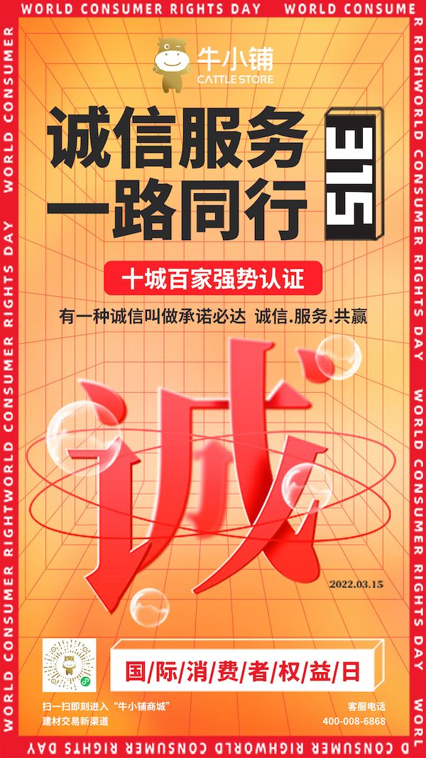 感恩一路同行,在今年“3·15”国际消费者权益日到来之际,牛小铺甄选百家深度合作伙伴,献礼“十城百家”优质诚信商铺,以此感谢长久以来的深度合作与信任。同时号召全体合作商户文明经营、诚信立业,为共铸建材行业诚信服务体系作出积极贡献,进而为广大消费者持续创造“安心、省心、放心”的服务体验。