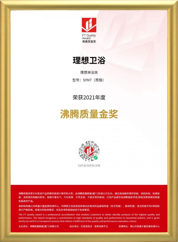 理想卫浴这次获奖的是一款SYM7(亮铬)淋浴房,参加此次质量测评的国家i级测评专家、佛山市质量计量监督检测中心工程师李业成说,理想卫浴参评的淋浴房SYM7(亮铬),经过检测机构对其送检样品基础性能(安全性能)、耐用性能、易洁性能中的6项指标进行严格检测,多项性能指标优于标准要求,在众多的参评对手中名列前茅,获得“沸腾质量金奖”当之无愧。
