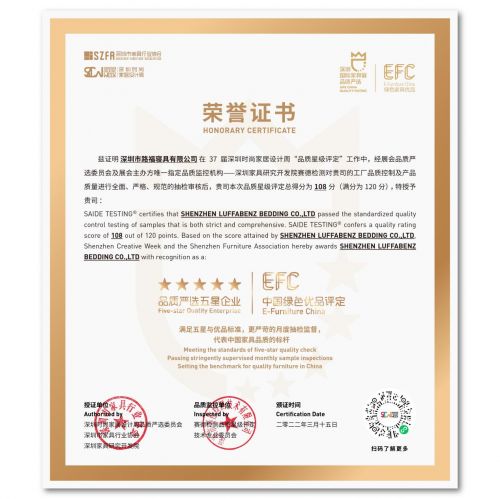 近日,深圳路福寝具有限公司在第37届深圳时尚家居设计周“品质星级评定”工作中,经展会品质严选委员会及展会主办方指定品质监控机构-深圳家具研究开发院赛德检测对路福寝具的工厂品质控制及产品质量进行全面、严格、规范的抽检审核后,授予路福寝具:品质严选五星企业及中国绿色优品评定。