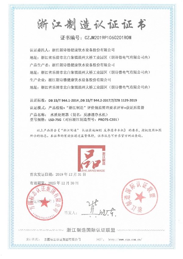 除此外,在2020年,朗诗德公司荣获浙江制造“品字标”认证。此项认证,代表了浙江制造业先进性的区域品牌形象标识,是高品质高水平的“代名词”。同年9月,朗诗德明星产品75C-纯水机顺利入驻“品字标”官方线上展厅,成为了对外展现浙江本土净水产品的品牌标志。