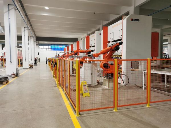在此基础上,金帝智慧工厂搭建3条由六轴机器人构成的自动冲压线,360°无死角,全自动冲压折弯。改变传统生产质量不稳定、效率低下的手工作业方式。