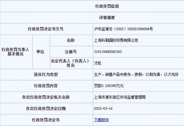 上海市市场监督管理局网站日前公布的行政处罚决定书(沪市监浦处〔2022〕152021006084号)显示,上海科勒国际贸易有限公司存在生产、销售产品中掺杂、掺假,以假充真,以次充好的违法行为,上海市浦东新区市场监督管理局对其罚款0.225395万元,处罚日期2022年3月16日。