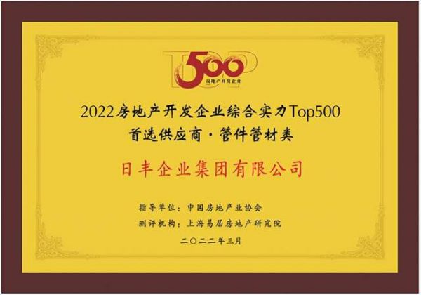 日丰集团入选2022房地产开发企业综合实力TOP500管材管件类首选供应商