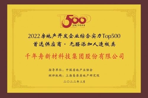 千年舟凭借领先的综合实力,荣膺「2022年房地产开发企业综合实力TOP500首选供应商·无醛添加人造板类」代表企业、「2022年房地产开发企业综合实力TOP500优选健康宅配套家居(板材、地板、木门、衣柜、橱柜)品牌」两项荣誉称号。