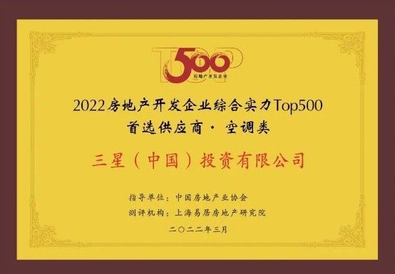 祝贺!三星中央空调再获2022房地产开发企业综合实力TOP500首选供应商