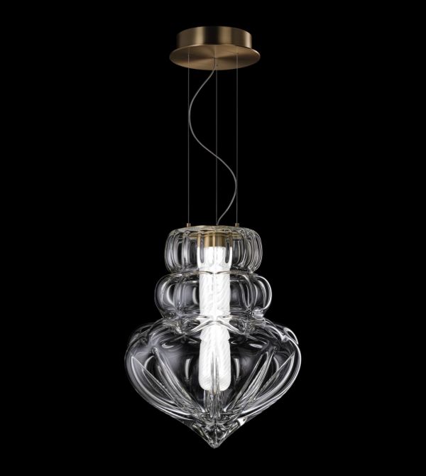 Barovier&Toso已经能够超越这一概念,以避「固定思维」的传统模式,开发了两种生动、令人回味,且富有张力的当代设计。这些模型是由两个集合共享的,以垂直延伸和对称覆盖的膨胀、蒸汽体积为标志,同时具备和谐优雅的比例。这些悬浮灯中的每一个都具有出色的表现力和发光力,无论是单独装置,或者是配置成排或成组的装置摆放,都能为空间增添无限迷人的特殊戏剧效果。