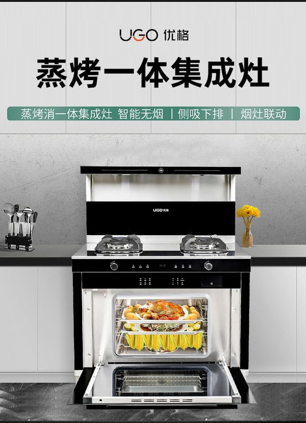 优格集成灶是一款集油烟机、燃气灶、蒸烤箱、消毒柜等多种功能于一体的厨房电器,具有节省空间、抽油烟效果好、节能低耗环保等优点。优格蒸烤一体集成灶有56L大容量、无缝蒸烤一体拉伸内胆等多个贴心设计,实用又安心。15分钟搞定一桌菜,充分满足一家人的需求。还有3D立体循环热风,保障食物整体烤的更均匀。蒸汽动态平衡技术和蒸汽后排,保证多种食物之间不会串味。