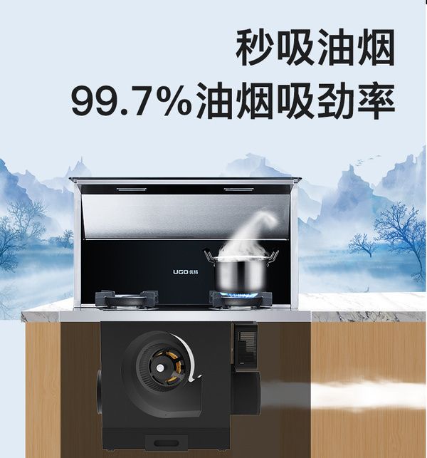 优格集成灶,颠覆传统吸油烟机的束缚,采用全新概念的侧吸下排技术,烟机与炒锅的距离完美控制在黄金控烟区。99.7%的高效油烟吸净率,在烹饪时,油烟产生即被吸走,厨房清新,健康呼吸!
