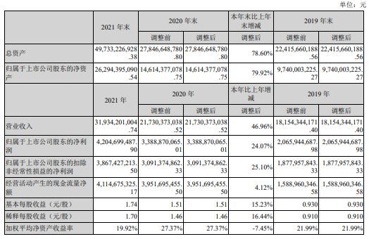4月12日,东方雨虹(002271)发布2021年年报。年报显示,东方雨虹2021年1-12月实现营业收入319.34亿元,同比增长46.96%,归属于上市公司股东的净利润为42.05亿元,同比增长24.07%,基本每股收益为1.74元,同比上涨15.23%。作为东方雨虹的第一大股东,李卫国目前持有其22.57%的股份。