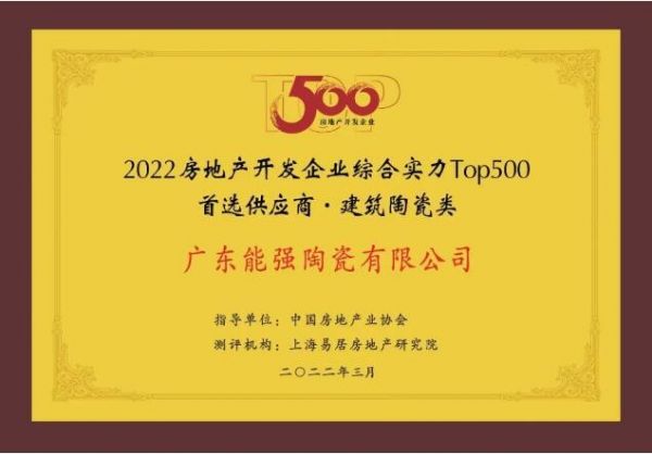 3月29日,以“新变局·新篇章”为主题的中国房地产开发企业综合实力测评成果发布会暨房地产高峰论坛于北京盛大举行。能强瓷砖以强大的品牌实力和闻名遐迩的知名度,连续6年蝉联房地产开发企业“Top500首选供应商”品牌。