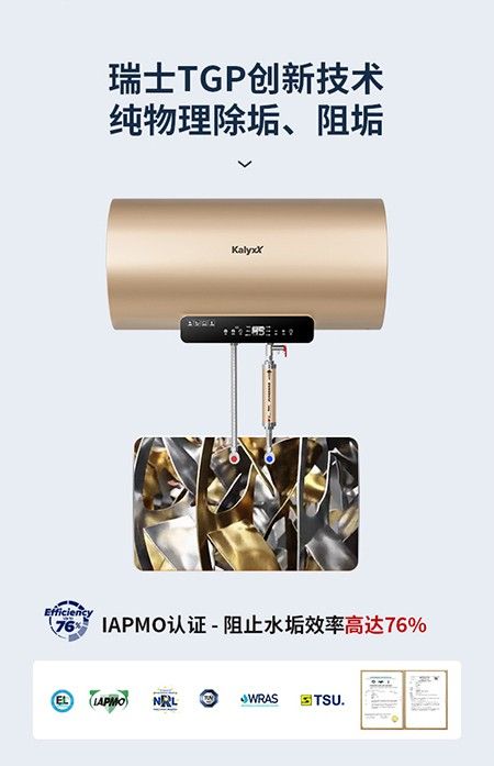据了解,在技术方面,卡力克思(KalyxX)防垢免清洗电热水器采用了创新的TGP-湍流电极化技术,通过引导水流通过多组由不同金属制成的涡轮状电极,同时以“空化”效应在水流中产生空洞,引导涡流中生成的气泡迅速溃灭以产生冲击波,进而通过原电池将较硬的方解石转化为较软的文石,使之更容易被水流带走。同时,经过处理的水不仅不容易结垢,还具有除垢的物理活性,然后水的PH值也发生了变化,从而达到除垢阻垢和鲜活水美肤的结果。