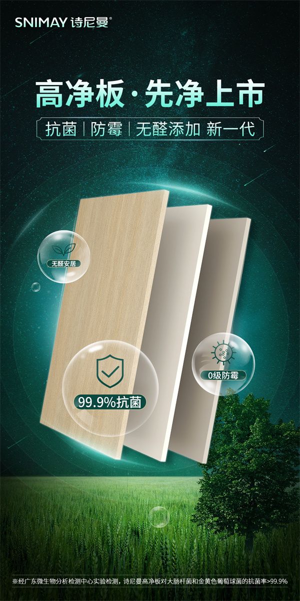 诗尼曼一直走在绿色家居的前列,免醛添加的环保板材早已为万千家庭标配健康舒适生活。高净板抗菌率99.9% 、0级防霉、ENF免醛添加,性能叠加,功能更强,三重先净守护性价比更高!