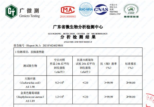 根据广东省微生物分析检测中心报告显示,高净板在大肠杆菌、金色葡萄球菌的抗菌反应测试结果均达99.9%。