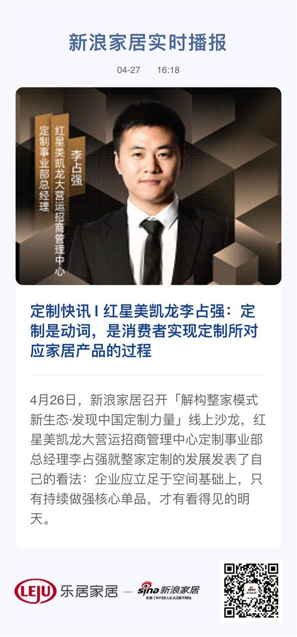 新浪定制频道讯 4月26日,新浪家居召开「解构整家模式新生态·发现中国定制力量」线上沙龙,红星美凯龙大营运招商管理中心定制事业部总经理李占强就整家定制的发展发表了自己的看法:企业应立足于空间基础上,只有持续做强核心单品,才有看得见的明天。