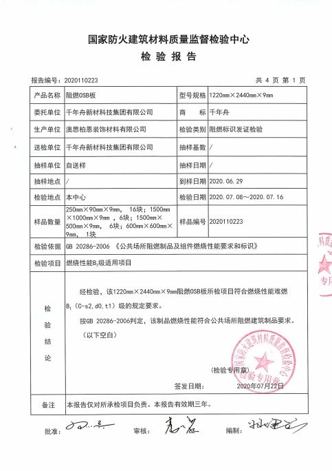 根据国家对难燃板的难燃等级划分,B级为难燃材料,B1级为B级中的最高标准,千年舟难燃OSB板燃烧性能等级可达B1级,同时产烟特性、燃烧滴落物、烟气毒性检测均达到较高要求。