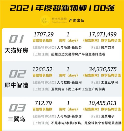 2021超新物种100强:天猫好房、犀牛智能、三翼鸟居TOP3