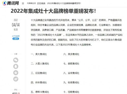 喜讯!德希卡集成灶荣获2022集成灶十大品牌