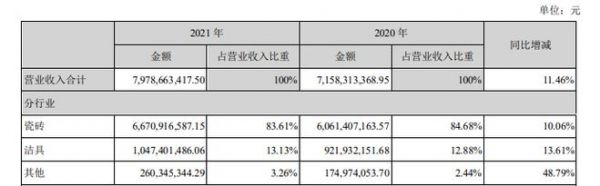 其中,瓷砖业务营业收入约66.71亿元,同比增长10.06%;卫浴业务营业收入约10.47亿元,同比增长13.61%。
