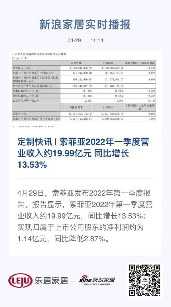 新浪定制频道讯 4月29日,索菲亚发布2022年第一季度报告。报告显示,索菲亚2022年第一季度营业收入约19.99亿元,同比增长13.53%;实现归属于上市公司股东的净利润约为1.14亿元,同比降低2.87%。